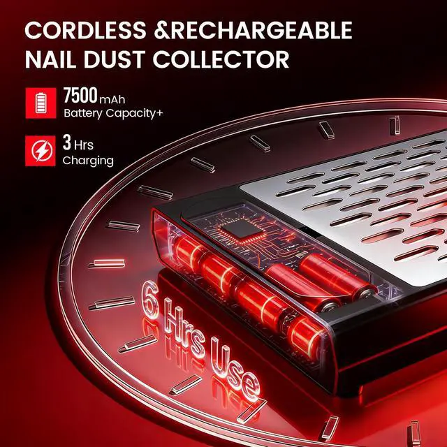 3. Long-Lasting Cordless Professional Nail Dust Collector: Powered by a 7500mAh battery (6 hrs runtime), this professional nail dust collector is fully rechargeable. It's globally compatible (100-240V) and must be used with its dedicated adapter for optimal safety.