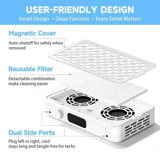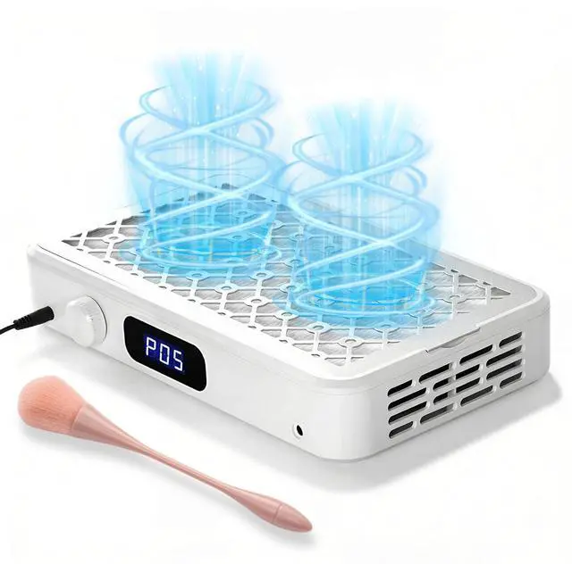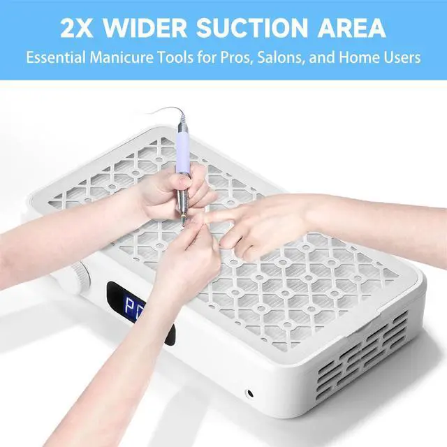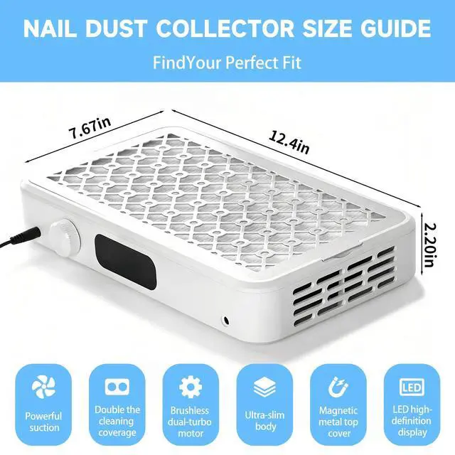 • 5-Speed Adjustment & LED DisplayEquipped with a sensitive adjustment knob and real-time LED display, this multifunctional nail fan dust collector provides five precise suction speeds for nail removal, shaping, engraving and hard gel polishing. This all-round nail duster fits beginners and professional nail techs, perfectly suitable for home manicure and salon stations. With a stylish appearance and practical functions, it is also a perfect holiday and birthday gift choice for nail art enthusiasts.