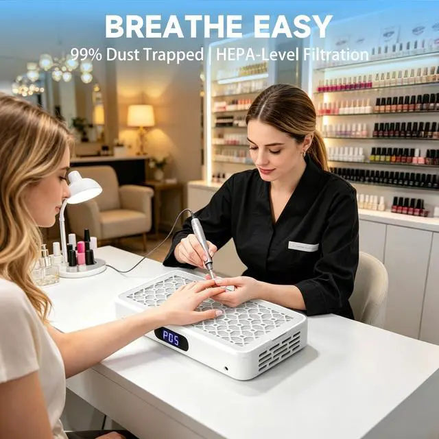 • Dual Brushless Motor & Salon SuctionPowered by two high-performance brushless turbo motors at 3500 RPM each with a total 7000 RPM for strong suction. This premium nail dust collector provides 90% better performance than ordinary single-motor units, an indispensable dust collector nail tech needs for daily manicure. Designed as a professional nail vacuum dust collector, it runs quietly with low friction and long service life. 360° omnidirectional suction captures 99% fine dust from gel, acrylic, dip powder and builder base, keeping your salon space clean, fresh and safe.