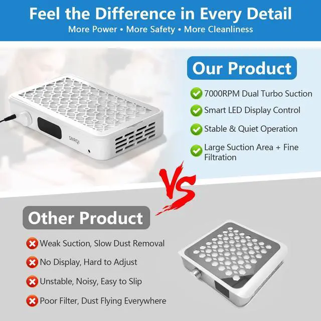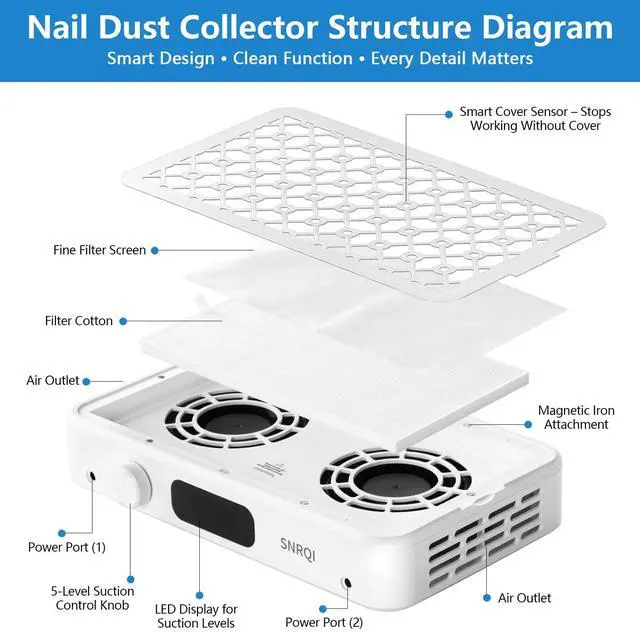 Dual Turbo Fan: The Nail Dust Collector has 2x3,500 rpm Turbo Fan, powered by dual turbochargers and high-quality brushless motor, can efficiently absorb and collect gel polishing chips and nail polish particles from 360 degrees, thus keeping the workspace clean, and the vacuum effect reaches 99.99%. The brushless motor reduces the noise, so it will not destroy the relaxing atmosphere of your nail salon or disturb the DIY meeting at home