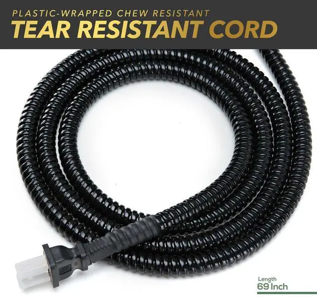 Electric power cord comes wrapped in chew-resistant plastic for pet safety.