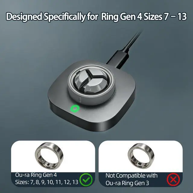 Gen 4 Only Check Compatibility: Designed exclusively for Ou-ra Ring Gen 4 (sizes 7-13). This ou-ra ring charger is not compatible with Gen 3 or other smart rings. Double-check the size engraved inside your ring before using