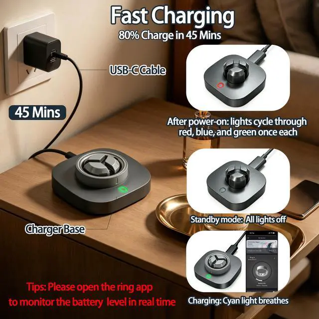 Compact & Travel-Friendly Design: Small enough to fit in any pocket or bag ideal for home, office, or travel. Package includes: 1x ou-ra charger dock, 1x 3.3ft USB-C cable, and 1x user manual. Charge your ring anytime, anywhere