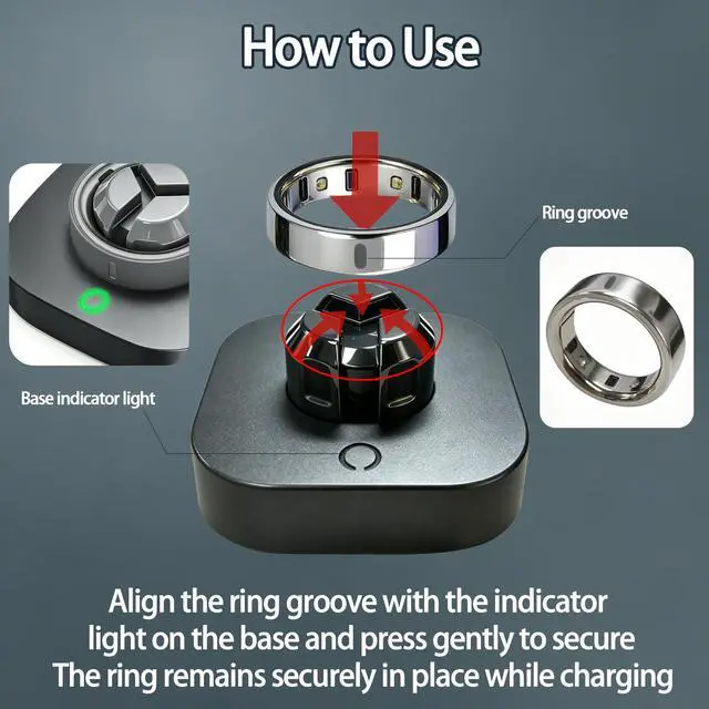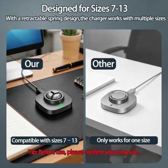 One Charger Fits Multiple Sizes: Unlike single-size docks, this ou-ra charger features a retractable design that fits ring sizes 7, 8, 9, 10, 11, 12, and 13. Please verify your ring size before using