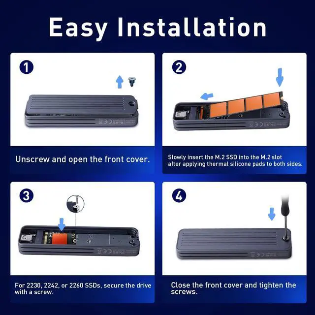 10Gbps High-Speed & Dual ProtocolFeatures a USB 3.2 Gen2 controller chip delivering up to 10Gbps transfer speeds, significantly improving work efficiency. Intelligently recognizes both M.2 NVMe and SATA dual protocols and automatically adapts to 2242/2260/2280-sized SSDs.