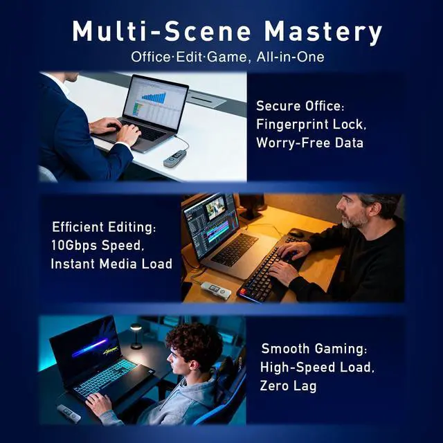 Ultimate Security & Speed VCOM Fingerprint Encryption SSD Enclosure with Military-Grade Biometric Technology and Real-Time LCD Display. Offers 10Gbps High-Speed Transfer, Perfect Compatibility with M.2 NVMe/SATA Dual Protocol, and Hardware-Level Encryption to Protect Your Data Security.