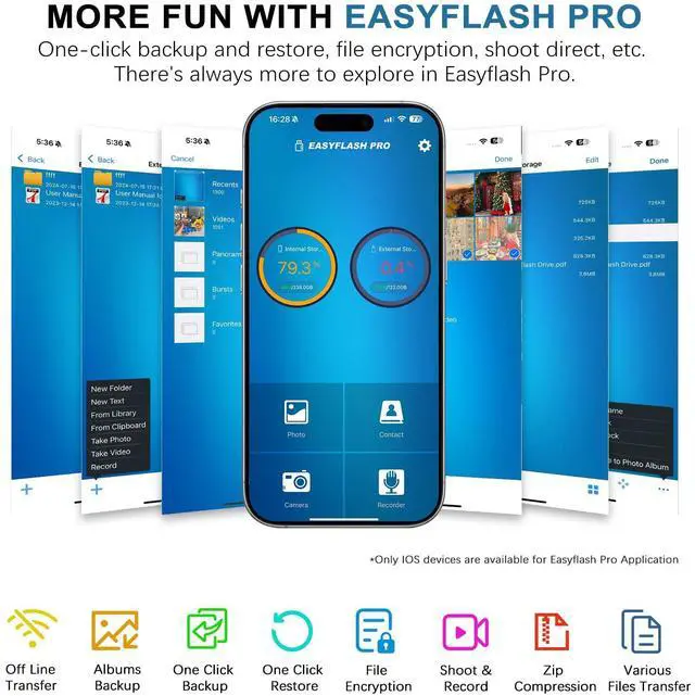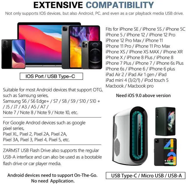 It will work with iPhone (iOS 9.0 or later), for Samsung Galaxy Series & Note Devices 6 Series and ABOVE, Windows and Macbook, Google Pixel and more. In short, ZARMST photo stick is a portable universal storage drive.
