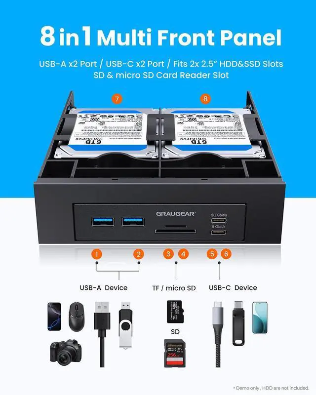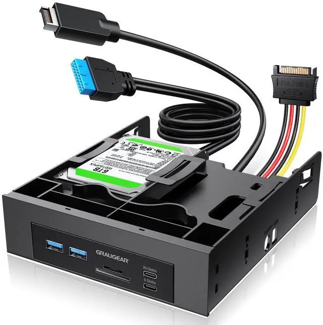 Upgrade your desktop PC with the GRAUGEAR 5.25” Multi Front Panel, designed to maximize front I/O accessibility and storage flexibility. This all-in-one solution combines a high-speed USB hub, SD/microSD card reader, and dual 2.5” SSD/HDD slots—perfect for creators, professionals, and power users.
