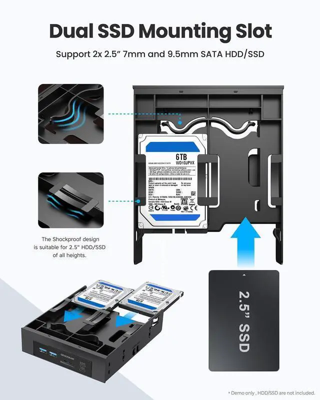 Install two 2.5” SATA drives—7mm or 9.5mm—in seconds with the built-in mounting tray. Shock-absorbing brackets ensure stability and performance, making it ideal for everyday storage.
