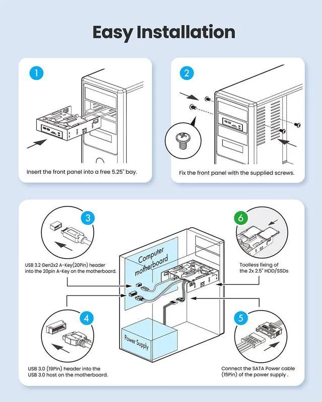 Seamlessly integrates with motherboards via USB 3.2 Gen 2x2 A-Key or USB 3.0 19-pin headers. Connect hard drives, flash drives, adapters, and more—all through a single front panel interface.