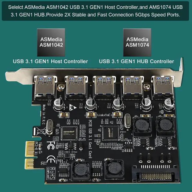 This LinksTek PCIE-U305A 5-Ports PCI Express USB 3.0 (USB 3.1 GEN1) type A 5Gbps expansion card is based on ASMedia ASM1042 USB 3.0 (USB 3.1 GEN1) host controller and ASM1074 USB 3.0 (USB 3.1 GEN1) HUB. It is designed on PCIE version 2.0 with PCIE X1 interface, provide 5Gbps total bandwidth for 5X USB-A ports. It will allow desktop PCs or working stations add 5X USB-A 5Gbps max USB 3.0 (USB 3.1 GEN1) ports for USB 3.0 (USB 3.1 GEN1) devices data transmission which include USB HDD/SSD enclosure, USB universal docking station, USB HUB, USB KVM switch, VR-System, USB graphic adapters and more USB devices. Built in LinksTek Smart Power Distribution Technology allow USB card to get 5V/2A 10W power on each port. Make sure connected USB device works in 5Gbps max speed. PCIE-U305A also reserved SATA power supply option, will make sure works on old type motherboard that cannot provide enough power.