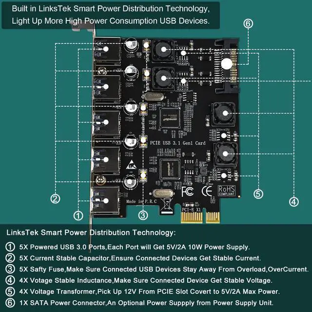 LinksTek Smart Power Distribution Technology is a new solution to provide more power supply on PCIE USB Cards. The previous versions of PCIE USB Card need to plug an external power cable from PSU. PCIE device can get 75W(12V/6.25A) max power from motherboard. LinksTek added 4X voltage transformer on USB ports, pick up 12V/5A from motherboard and transfer to 5V/10A. Each USB port will get 5V/2A 10W max power for USB device. Apart from this, LinksTek Smart Power Distribution Technology built 5X Safety Fuse, 5X voltage stable capacitor and 5X current stable inductance USB Ports makes sure users never burn USB devices.