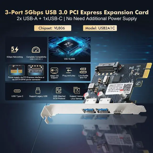 PCI Express VL806 USB adapter is complies with Super-Speed (5 Gbps), High-Speed (480 Mbps), Full-Speed (12 Mbps), and Low-Speed (1.5 Mbps) devices. It enabling the simultaneous operation of 2xUSB-A + 1xUSB-C peripheral devices.