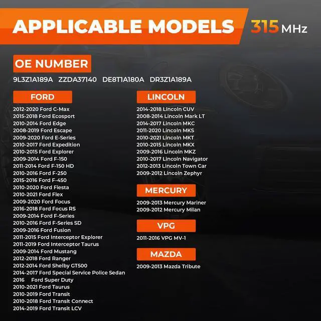 • FITMENT/COMPATIBILITY: Fit for 2012-2014 Ford Shelby GT500, 2014-2017 Ford Special Service Police Sedan, 2016 Ford Super Duty, 2010.05-2021 Ford Taurus, 2010-2019 Ford Transit, 2010-2018 Ford Transit Connect, 2014-2019 Ford Transit LCV, 2014-2018 Lincoln CUV, 2008.08-2014 Lincoln Mark LT, 2014.04-2017.08 Lincoln MKC, 2011-2020 Lincoln MKS, 2010.08-2021 Lincoln MKT, 2010.07-2015.07 Lincoln MKX, 2009.02-2016 Lincoln MKZ, 2010.08-2017 Lincoln Navigator, 2012-2013 Lincoln Town Car, 2009.02-2012 Lincoln Zephyr, 2009-2013 Mercury Mariner, 2009.02-2012 Mercury Milan, 2011-2016 VPG MV-1, 2009-2013 Mazda Tribute