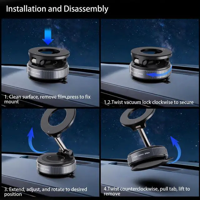 Innovative Suction Cup Base with Unmatched StabilityUpgraded suction cup phone mount creates a vacuum seal that grips firmly on windshields, dashboards, or any smooth surface - even in extreme temperatures.It stays rock-solid through bumpy roads yet removes cleanly without residue.(Includes a free dashboard pad specifically designed for textured surfaces - simply attach your suction cup phone mount to this adhesive platform for rock-solid positioning on grainy dashboards).
