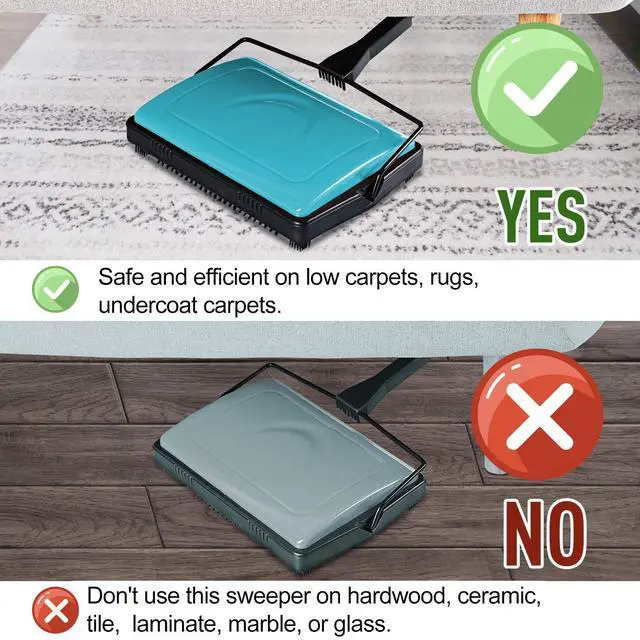 • Carpet Sweeper MULTIFUNCTIONAL: Safe and efficient on low carpets, rugs, undercoat carpets. Please DON'T use it on floors like hardwood, ceramic, tile, laminate, marble or glass. It only works best on carpets