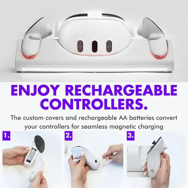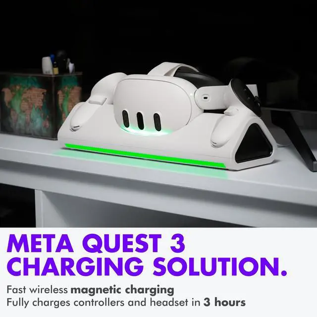 Fast Magnetic Charging: Our charging docking station allows you to simply drop your Quest 3 headset and controllers on the dock for fast, instant and cable-free charging. (Headset: 3 hours) (Controllers: 3 hours)