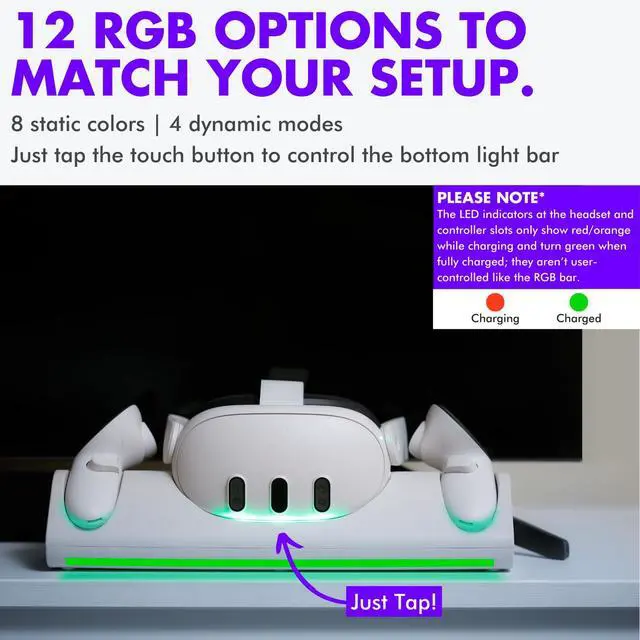 LED Charging Indicators: With easy to read LED indicators, the charger lets you know instantly when your headset and controllers are ready - orange means charging, green means fully charged