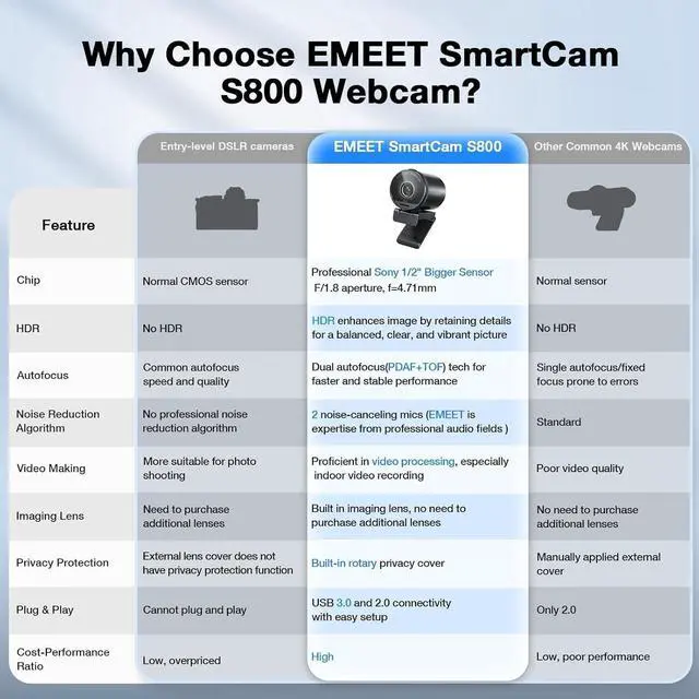 Convenient Plug & Play, Guaranteed Privacy - The S800 4K streaming webcam combines ease of use with top-tier security. With USB 3.0 and 2.0 plug-and-play functionality, this 4K webcam ensures easy connectivity, high-speed data transfer, and stable performance without complex drivers. Privacy protection features include a physical cover to block the lens, no WiFi to prevent breaches, no Bluetooth to avoid leaks, no drivers to reduce vulnerabilities, and no cloud storage to keep all data local.