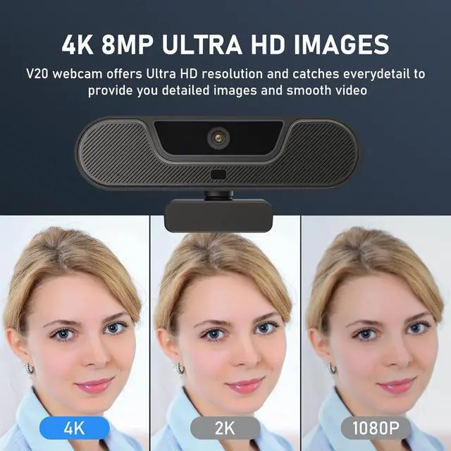 4K Ultra HD Webcam: V20 4K webcam with 8 megapixel CMOS sensor, supports up to 4K@25FPS, 2K@60FPS, 1080P@60FPS,720p@60fps video transmission, delivering excellent video quality. Delivers crisp clear images and fluid video while gaming, video calling, online teaching, live streaming, or recording