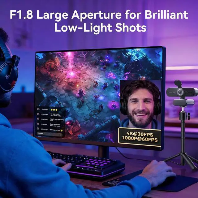 High Compatibility Tripod - The tripod of this 4K webcam for PC comes with a universal joint, supporting 360° rotation and flexible viewing angle, making it very suitable for live streaming scenes with multiple movements. Equipped with a 1/4-inch screw, the C60E webcam with tripod seamlessly pairs with various devices, including webcams, phones, cameras, and Action cameras. It facilitates diverse daily needs like live streaming, video recording, gathering moments, and online meetings.