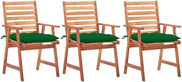 This contemporary wooden dining chair set with cushions will add a touch of natural style to your garden, terrace or patio. This wooden chair set will be a great choice for al fresco dining. These patio chairs are made of solid acacia wood, a tropical hardwood, which is weather-resistant and durable for years of use. The oil finished surface is easy to clean with a damp cloth. The slatted design will bring a rustic charm. What's more, the included cushions provide extra comfort while seating. It is made of 100% polyester that has been treated to make it waterproof.
