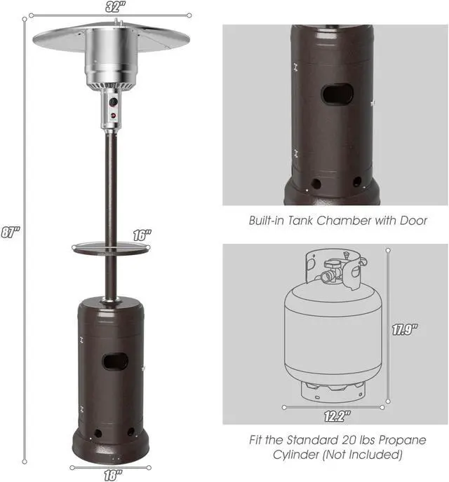 User-Friendly Design: Comes with two small wheels at side, this patio heater stand can be easily transport to any where you like without any load, And it features a built-in space for hiding the fuel tank to save space, Add extra shelf for you to place some drinks and wines, you can enjoy the leisure time with your friends or family at all times, no matter what the location.
