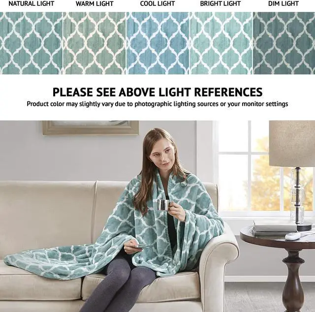Ogee Printed Plush Electric Blanket for Cold Weather, Fast Heating, Auto Shut Off, Virtually Zero EMF, Multi Heat Setting, UL Certified, Machine Washable, Aqua Oversized Throw 60x70