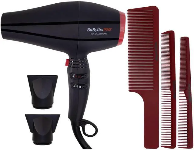 BABYLISS PRO PROFESSIONAL TURBO XTREME HAIR DRYER BAB9400UC (BLACK) + BABYLISS PRO BARBEROLOGY COMB SET (CLIPPER, CUTTING, TAPER COMBS) - REDBaBylissPRO BAB9400UC Turbo Xtreme Professional Hair Dryer The BaBylissPRO Turbo Xtreme hair dryer is a stellar combination of power, speed, and design. This 1875 Watt dryer offers speed and high heat performance and the True Ion generator delivers more shine and less frizz