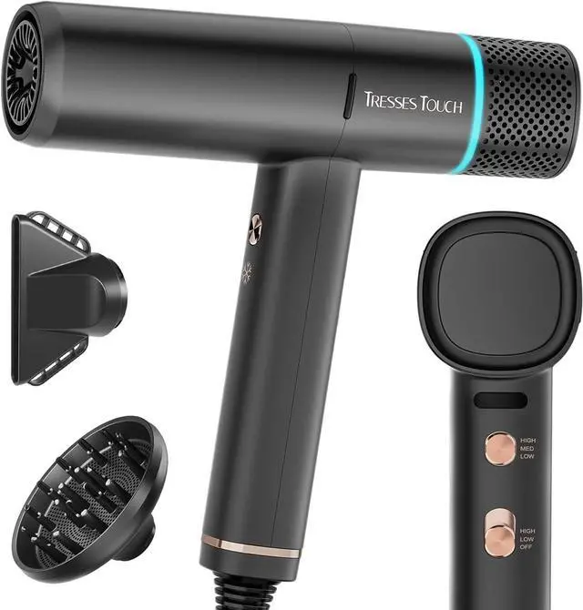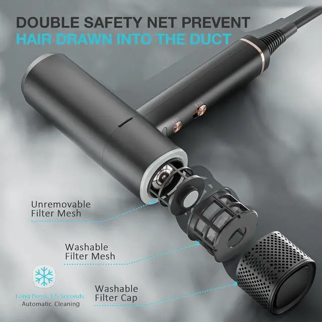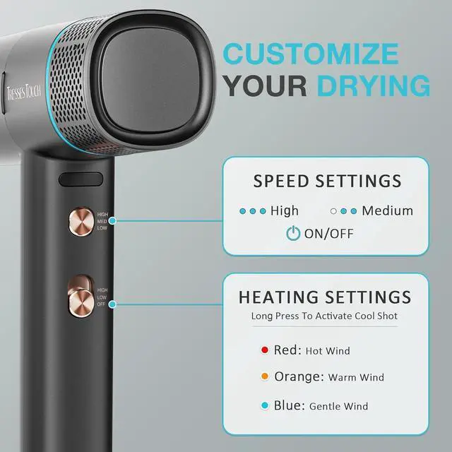 Smart Wind Temp Light Ring: Features three heat settings (High/Medium/Low), two speed settings, and a cool shot mode; indicator lights for easy monitoring and adjustment - blue for gentle, orange for warm, red for hot; long press the cool shot button for optimal styling