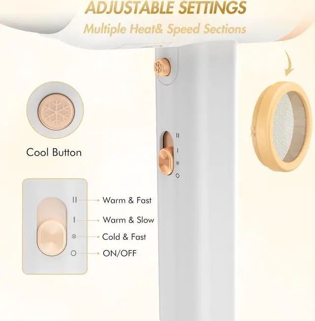 Adjustable Settings & Safety ProtectionThe blow dryer with diffuser easily controls heat and speed through independent cold air button to protect the hair and meet your specific needs. The low magnetic wave structure technology of hair dryer reduces radiation. The overheat protection and automatic power-off functions ensure safe using and extend product life. [Tip: Applicable to voltage range 110V-120V. ]