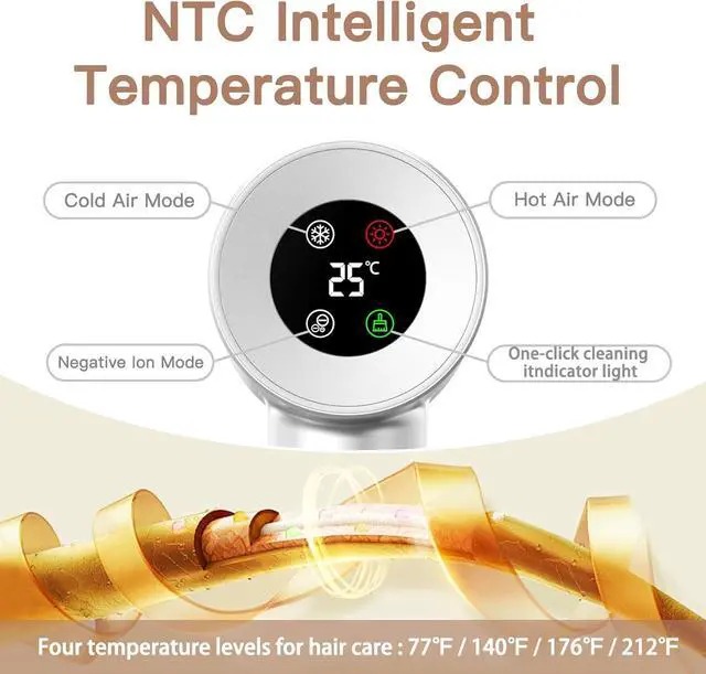 HD Digital Display: Our hair dryer with attachments offers 4 heat settings (Room Temperature/77°F/140°F/176°F/ 212°F) and 2 speed settings and 4 modes for a total of 10 different combinations. This allows you to customize the drying combination that best suits your hair and meets people' s different drying needs. And the HD LCD of the hairdryer allows you to easily adjust the settings. One-touch reverses cleaning function.