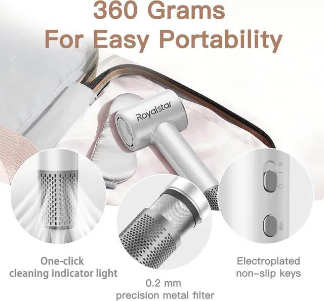 Low Noise & Portable: The travel hair dryer operates only at 59db. And it weighs only 0.79 lbs/360g. The ergonomic design ensures a comfortable grip and simple buttons, this hairdryer comes with magnetic nozzles that rotate 360°. Compact size and ingenious design, the royalstar hair dryer for women and others are an ideal companion for travel or home use!