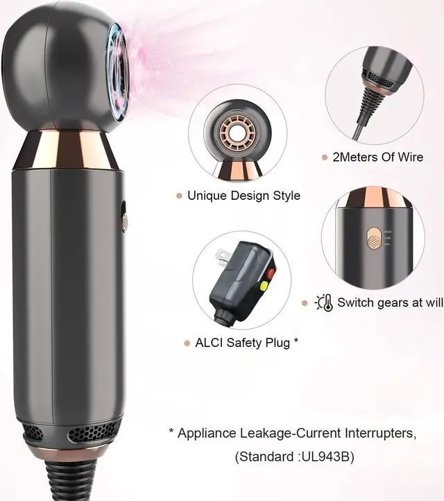 Ergonomic Handle and ALCI Safety Plug: The portable hair dryer lightweight shape, not tired after long time use, and equipped with ALCI protective plug, which ensure the safety of you and your family