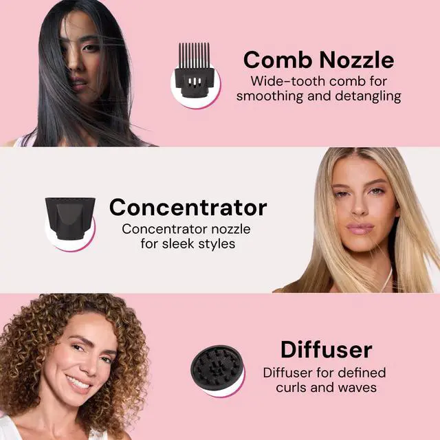 3 VERSATILE STYLING ATTACHMENTS: Your all-in-one styling tool. Define perfect curls with the Diffuser, achieve sleek looks with the Concentrator, or gently detangle and smooth with the wide-tooth Comb.