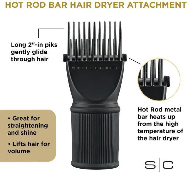 Not your ordinary pik, our styling comb is equipped with a hot-rod metal bar that borrows heat from the dryer. It increases the effectiveness of the pik, allowing you to style your hair at a faster rate.