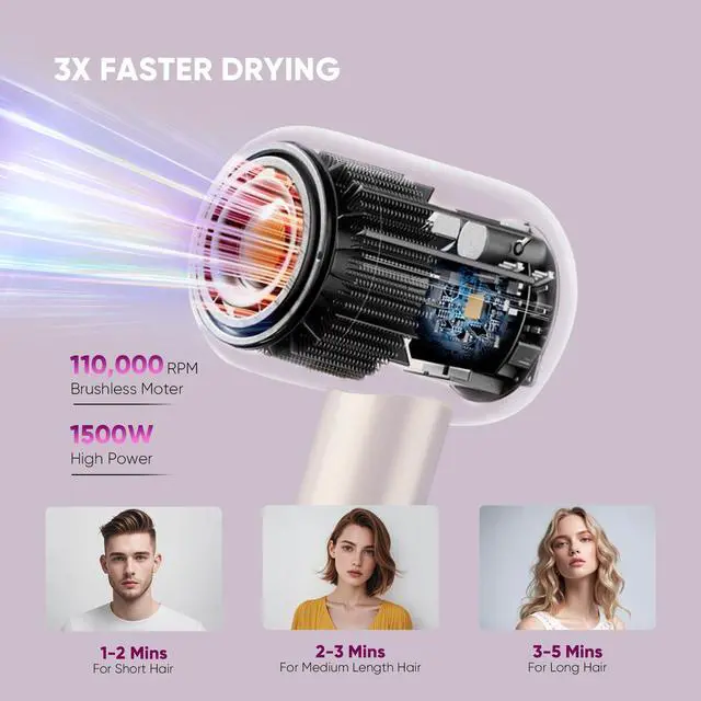 110,000 RPM High-Speed DryingEquipped with an ultra-precise brushless motor, SensaWave hair dryer delivers 110,000 RPM power for 5X faster drying than conventional dryers. The magnetic diffuser/nozzle clicks effortlessly into place, enabling quick customization for voluminous curls, sleek straight styles, or targeted scalp dryingno fumbling, no drop-offs
