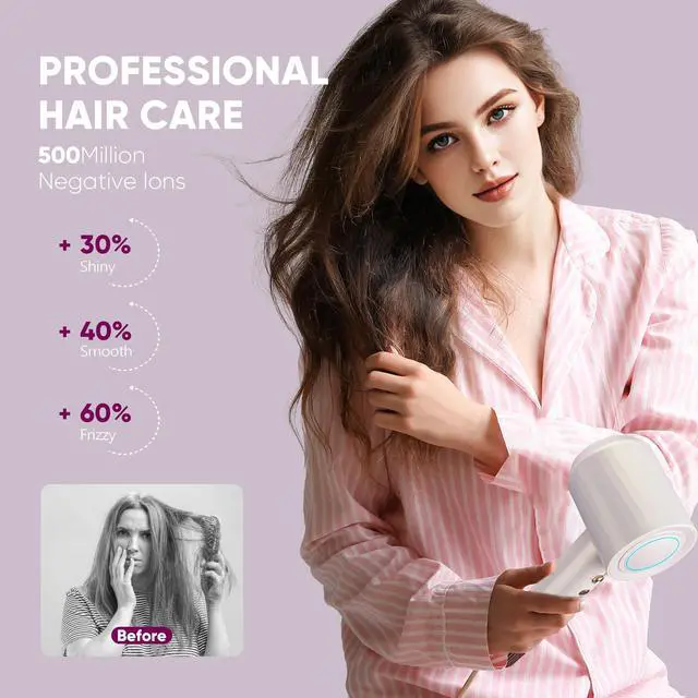 Advanced Ionic Care for Frizz-Free Shine500 million high-density negative ions penetrate hair cuticles in seconds, neutralizing static, sealing moisture, and smoothing frizz. Experience salon-level shine with 62% reduced breakage and up to 98% humidity resistance for all-day sleekness, even in rainy climates.