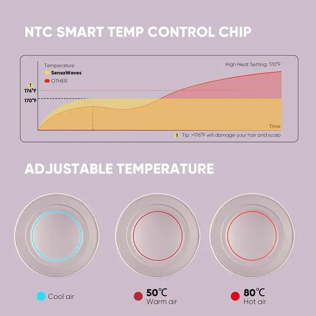 Smart Temperature ControlNTC sensors monitor heat 110 times/sec, auto-adjusting between 3 modes (Red: 176°F / Orange: 122°F / Green: Cool) to prevent overheating. The intuitive LED halo glows to indicate settingsperfect for fine, color-treated, or thick curly hair needing precise heat control.