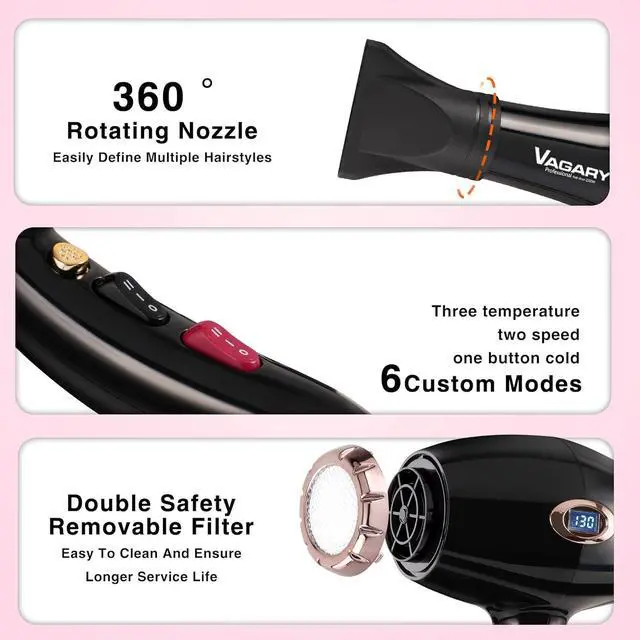 Men & Women: This Vagary hair dryer is equiped with a 2200W AC Motor, offers faster drying experience than others. It just takes 2-6 minutes to make your hair smoothy and shinny, which can reduce much time for you