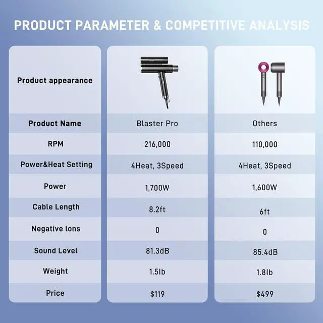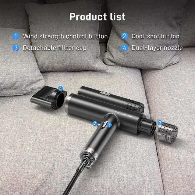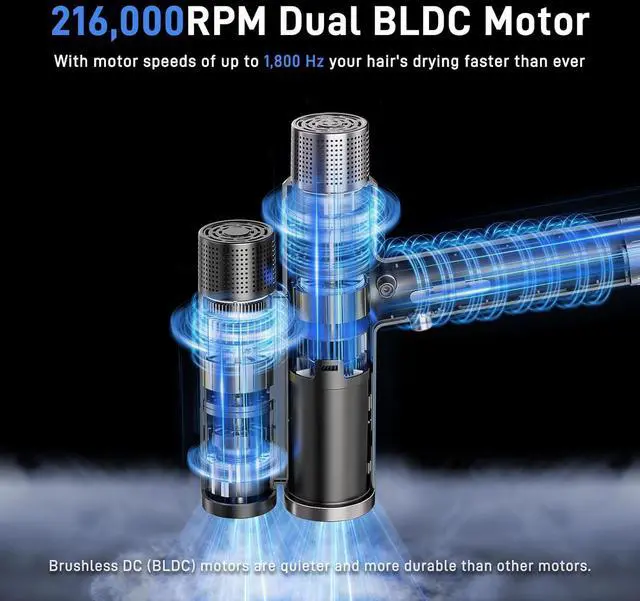 Revolutionary 216, 000 RPM Dual Brushless MotorHurricane Pro hair dryer uses a high-speed brushless dual motor and double air outlet to reduce drying time by up to 50%. With wind speeds reaching 58m/s, it delivers powerful airflow for fast, smooth drying.