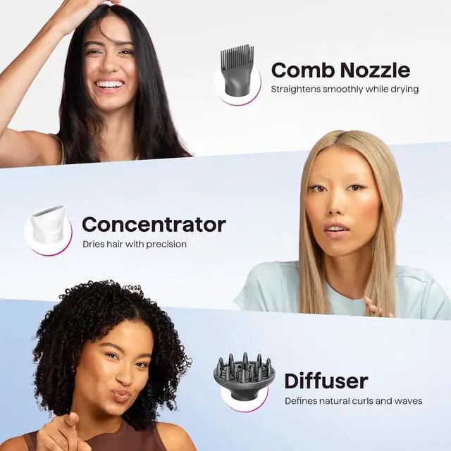 3 Attachments for Every Style: A concentrated nozzle delivers precision airflow, allowing for targeted styling and greater control. The diffuser reduces frizz while enhancing and defining natural curls or waves. The comb attachment smooths and straightens, making it perfect for managing thick, unruly hair with ease.