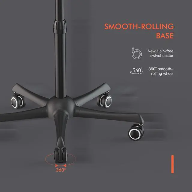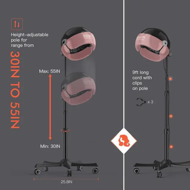 360-Degree Upgrade Wheel: With a 9 ft cord, 3 clips, and 5 upgraded wheels, this hooded hair dryer moves easily in your home or salon. The improved casters prevent hair from getting stuck, and the adjustable hood (30" to 55") fits your height perfectly