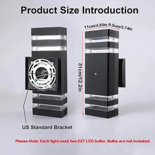 Easy to Install LED Porch Lights for Wall: Our outdoor wall light Dimensions: 4.33" length x 3.74" wide x 12.2" high. Hard-wired, black exterior wall light Includes all mounting hardware for quick and easy installation. (NOTE: Each light need two E27 LED bulbs. Additional purchase required.)