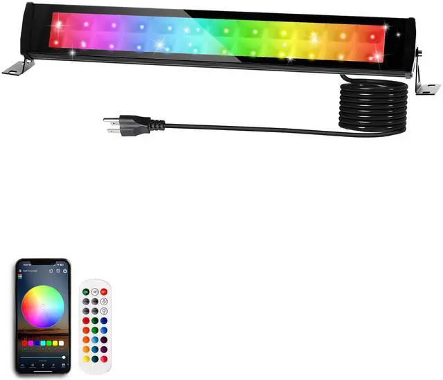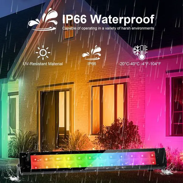 • Multifunctional 50W RGB Wall Washer Light The 50W RGB Wall Washer Light features 24 high-quality RGB LED chips, low heat generation, super bright and energy-efficient, and can operate all night long. The RGB LED floodlight features 16 million color changes, flash, strobe, fade, smooth, and more, with 20 modes (adjustable brightness/speed). You can choose different colors or modes for different scenes, and the RGB Wall Washer Light can meet all your lighting needs.