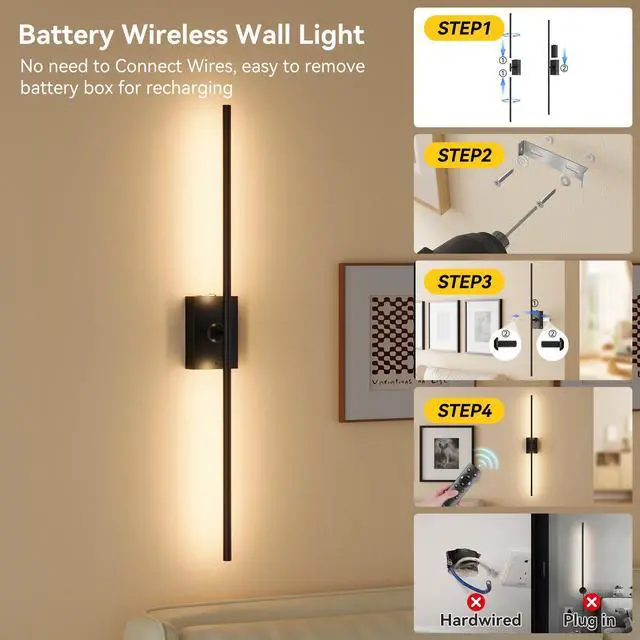 Equipped with two remote controls, you can adjust the lighting by remote. Whats more, it also support touch control on the light base. Battery wall light with 30/60/120/240 mins auto-off setting. Memory function, when turned back on, the light color and brightness remain the same as before they were turned off, no need to set every time