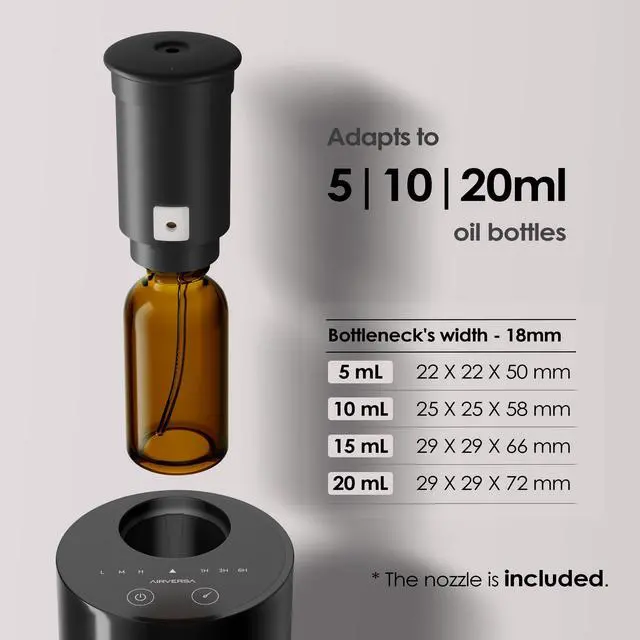 Lasting Oil & Easy Compatibility Designed to work with US standard 5/10/15/20mL essential oil bottles on the market. A single 20mL bottle can deliver days of continuous fragrance, depending on setting, minimizing the need for frequent refills. Installation is a breeze. Simply remove the cap from the retail oil bottle and screw the oil bottle onto the nozzle, or pour the oil into the oil bottle supplied in the box