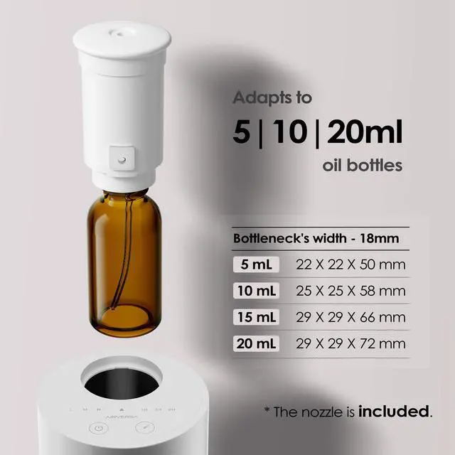 Lasting Oil & Easy Compatibility Designed to work with US standard 5/10/15/20mL essential oil bottles on the market. A single 20mL bottle can deliver days of continuous fragrance, depending on setting, minimizing the need for frequent refills. Installation is a breeze. Simply remove the cap from the retail oil bottle and screw the oil bottle onto the nozzle, or pour the oil into the oil bottle supplied in the box