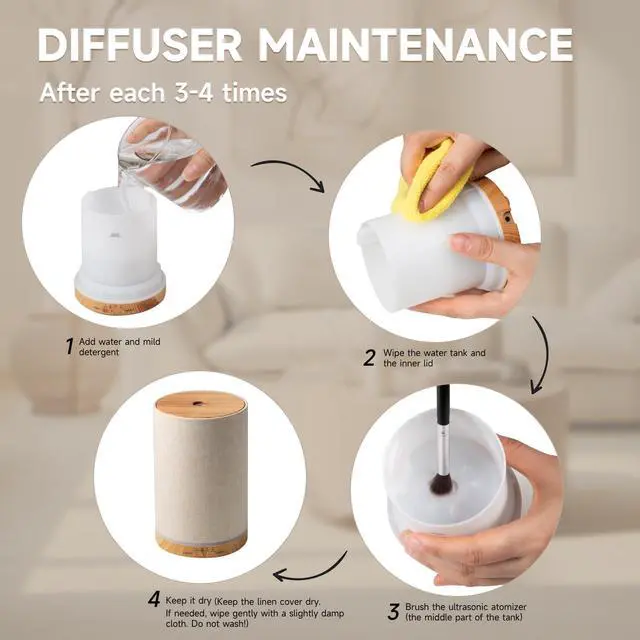 Clean at least once a week, or 2–3 times weekly with heavy oil use: power off and unplug, empty the tank, wipe the tank and ultrasonic plate with a soft cloth and mild detergent, keep the fabric cover dry, let it air-dry, then refill.