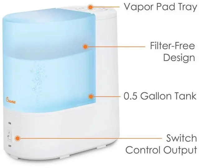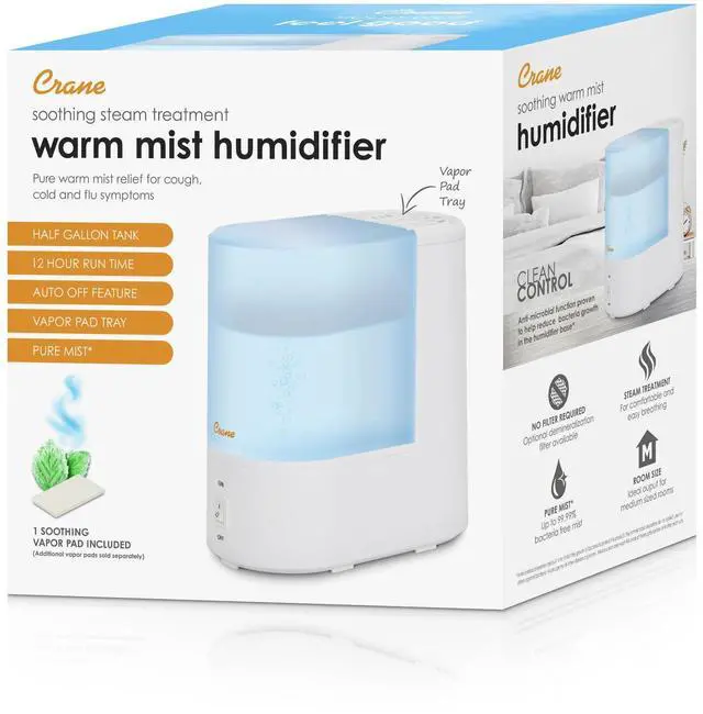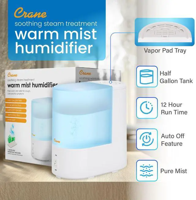 Relieve dryness and breathe easier with the Crane 0.5 Gallon Warm Mist Humidifier, a compact solution designed to add soothing moisture to dry indoor air. Ideal for bedrooms, offices, and small living spaces, this warm mist humidifier creates a comforting environment while helping to reduce the effects of dry skin, sinus irritation, and congestion. With whisper-quiet performance and automatic shut-off, its one of the most reliable humidifiers for bedroom and everyday home use. This small humidifier delivers up to 12 hours of warm mist from its 0.5-gallon tank, balancing humidity naturally for year-round comfort. Designed for simplicity, its an easy to clean humidifier thats quick to refill and maintainperfect for busy households. Its sleek design fits seamlessly into modern interiors while offering powerful performance in a portable form. Whether youre looking to add humidity to your home office, bedroom, or apartment, the Crane Warm Mist Humidifier provides a quiet, efficient, and refreshing way to improve your indoor air quality. Experience the difference of clean, warm moisture every daytrusted humidifiers for home start with Crane.